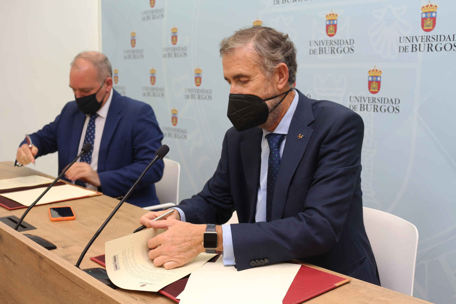 El rector de la Universidad de Burgos, don Manuel Pérez Mateos, y don Álvaro Enrique de Villamor y Soraluce, presidente del Instituto Nacional Auschwitz Birkenau-España y cónsul honorario de la República Polaca; han suscrito un convenio de colaboración