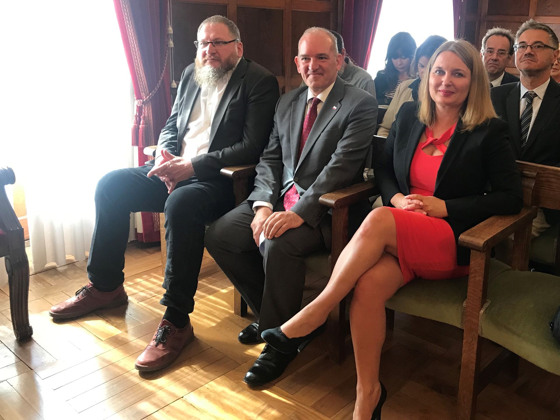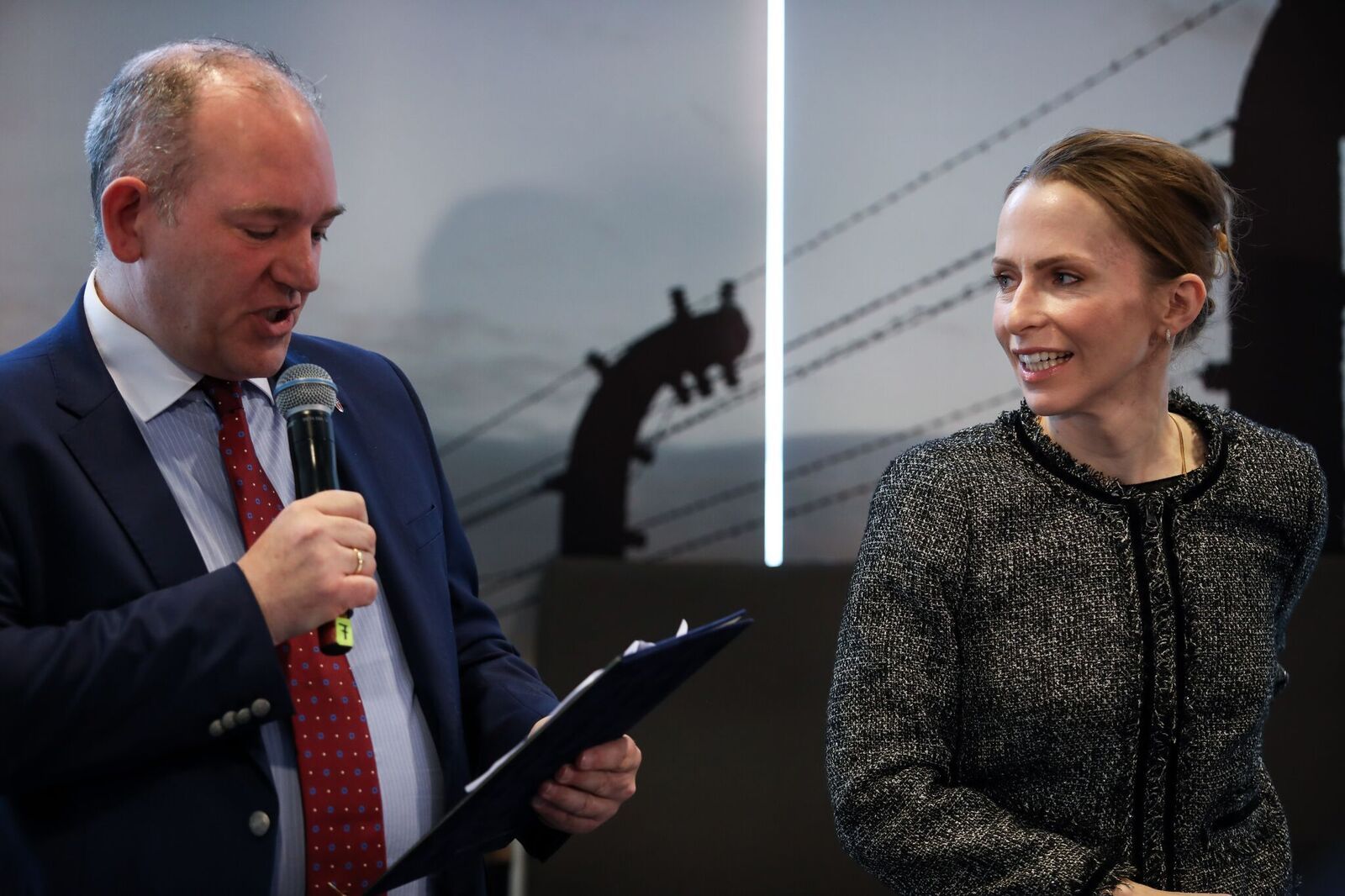 El Director del Museo Estatal Auschwitz Birkenau Dr. Piotr Cywinski, acompañado Maria Ossolinska Directora de la Red de la Diplomacia de la Memoria presentan los objetivos del Instituto Auschwitz Birkenau España junto a Enrique de Villamor.